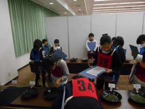 採点中に子供たちを飽きさせないようにサムライ茶人ショーとして、サムライに扮したパフォーマーさんがトリッキーな動きでお茶淹れをして楽しませながら、廻し注ぎ、お茶の種類を子供たちに伝授していました。